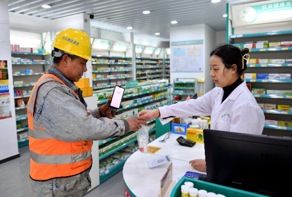 在雄安新区一家药店内,顾客在购买药品。图源:新华社