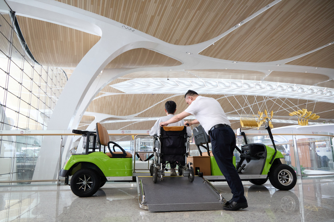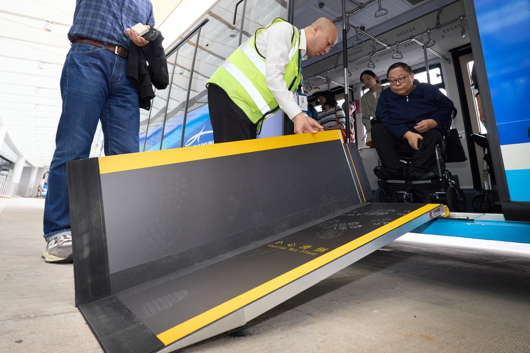 T3航站楼在无障碍方面的提升还体现在解决登机前“最后几公里”的问题上。记者了解到,过去,轮椅使用者如果要乘坐机场电瓶车,要将轮椅先折叠收起,再在工作人员的帮助下乘车。但白云机场首创推出无障碍电瓶车后,轮椅可以很轻松地开到车上,免去了行动不便人士上下轮椅的麻烦。轮椅朋友到了摆渡车前,就会有工作人员贴心地铺好轻便又结实的碳纤维登机导板,协助推行轮椅使用者上车,解决车厢与地面落差带来的登车难题。