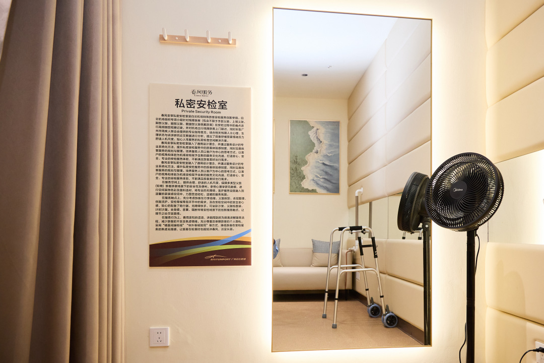 这种让服务更有温度的理念,也延伸到了更具体的服务空间中。记者在现场看到,安检私密检查室除了配备辅具架、抓杆、扶手等基础设施外,还为听障人士准备了用于笔谈交流的小白板,为义肢人士提供了整理仪容的全身镜、侧身镜,充分体现尊重与关怀。