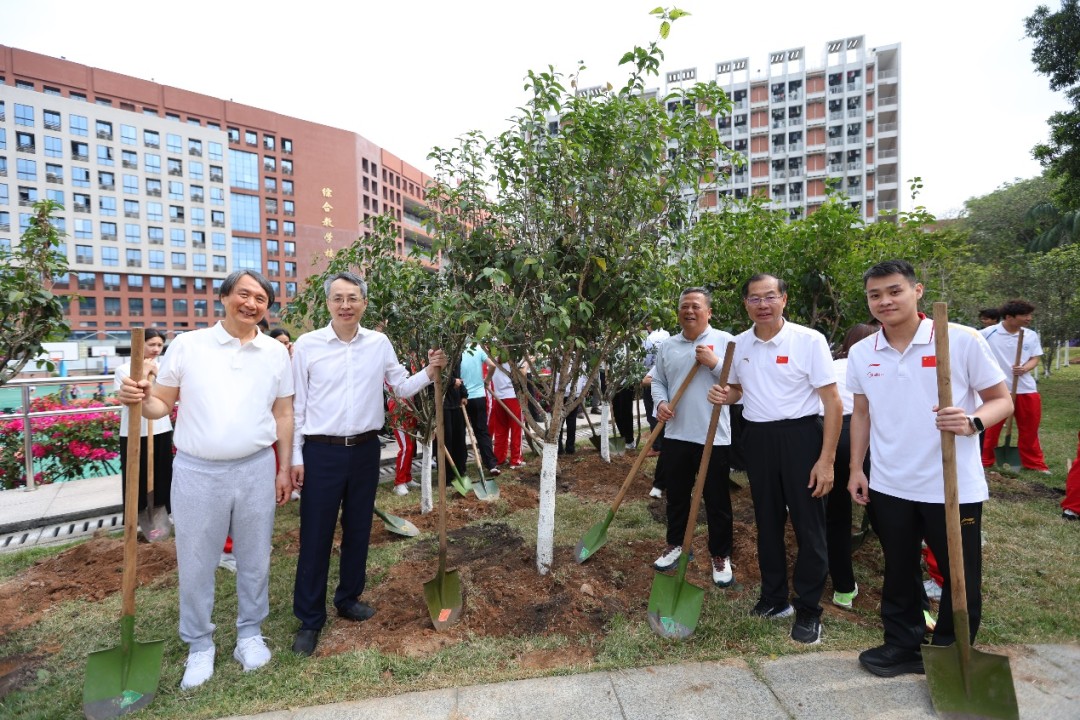 3月24日,广州体育职业技术学院举办“冠军林”植树活动和冠军讲坛暨冠军摇篮里的思政课。众多杰出校友齐聚一堂,跳水奥运冠军张雁全,跳水世界冠军谢佩铃,十五运会拳击冠军朱健豪、武术套路冠军李剑鸣、体操冠军钟嘉彤、篮球冠军于东,跳绳世界冠军张崇杨、谢凯宇、陈嘉伟与学院及有关学校师生、“百千万工程”“双百行动”合作单位负责人共育“冠军林”,并为大中小学师生带来了一堂别开生面、振奋人心的思政课,以植树践初心,以榜样润青春,让冠军精神与绿色希望双向奔赴。广州市体育局、广州市水务局、广州体育职业技术学院相关负责人出席植树活动。