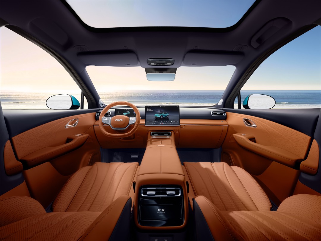智能座舱方面,新车搭载3纳米制程旗舰级座舱芯片,CPU算力280k DMIPS,GPU算力4TFLOP,NPU算力54TOPS,优于8295芯片。AI语音助手基于13亿参数本地语音大模型,支持全场景语音交互。座舱配备风云UI 2.0交互系统,搭载全新电子电器架构EEA5.1架构,支持全品牌智能手机互联。