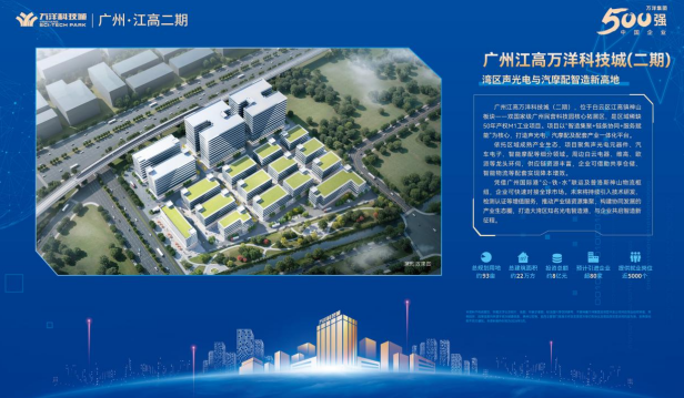 广州江高万洋科技城(二期),位于白云区江高神山板块,属国家级广州民营科技园核心拓展区,是区域稀缺 50 年产权 M1工业项目。项目总规划用地约 93 亩,总建筑面积约 22 万㎡,投资总额约 8 亿元;项目以“智造集聚+链条协同+服务赋能”为核心,打造声光电、汽摩配及配套产业一体化平台,计划引进企业超 80 家,提供就业岗位超 5000 个。项目将于2028年实现首批交付投产,全部达产后年产值约9亿元,年创税约6000万元。