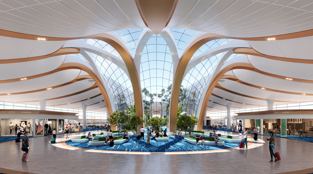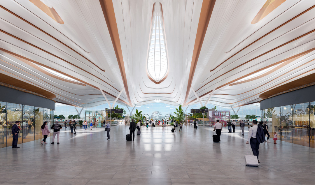 广州新机场在设计上深度融合“岭南文化”与“四型机场”建设要求,从佛山祖庙、龙舟、醒狮等传统文化元素中汲取灵感,采用六指廊构型与流线型交错拱屋顶,既高效利用站坪空间,又蕴含“千龙竞发”“雄狮醒耀”的时代寓意,将成为彰显岭南文化自信的门户地标。航站楼内部将打造岭南特色园林景观与现代科技感值机区,全面构建“平安、绿色、智慧、人文”的现代化机场运营体系,实现安全防控智能化、工程建设低碳化、运行管理精细化、旅客服务品质化。
