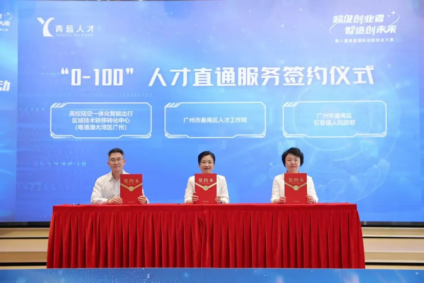 活动现场,番禺区人才工作局与陆空一体化智能出行分中心、狮子洋智造创新园属地石碁镇人民政府三方联动,签订“0-100”人才直通服务协议,以人才政策赋能项目孵化、产业化全链条,让创新创业团队从青蓝大赛走出来,直接进入智能出行分中心转化,再到狮子洋智造创新园落地——0到100的路,在番禺正式打通。