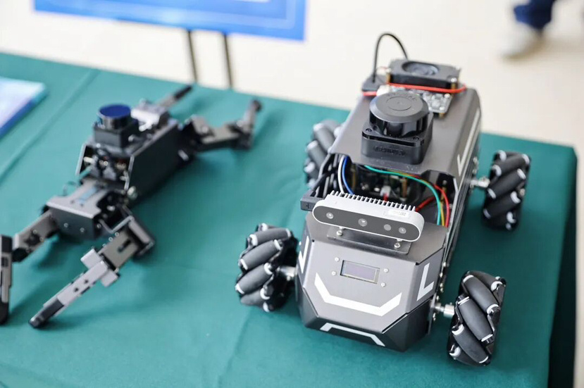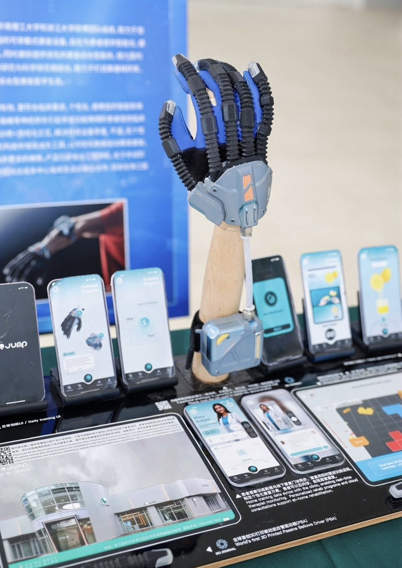其中一个人工智能团队带来了四台智能设备,均实现AI技术与硬件实操深度融合,打造沉浸式AI实训体验,无人机具备人脸识别、物体跟踪、编队飞行等功能,是入门级教学与竞赛优选硬件;而一个医疗科技团队展示的康复手套,采用柔性仿生结构设计,核心突破在于模拟人体手部骨骼肌肉的运动机理,实现了从“刚性驱动”到“柔性适配”的转变。
