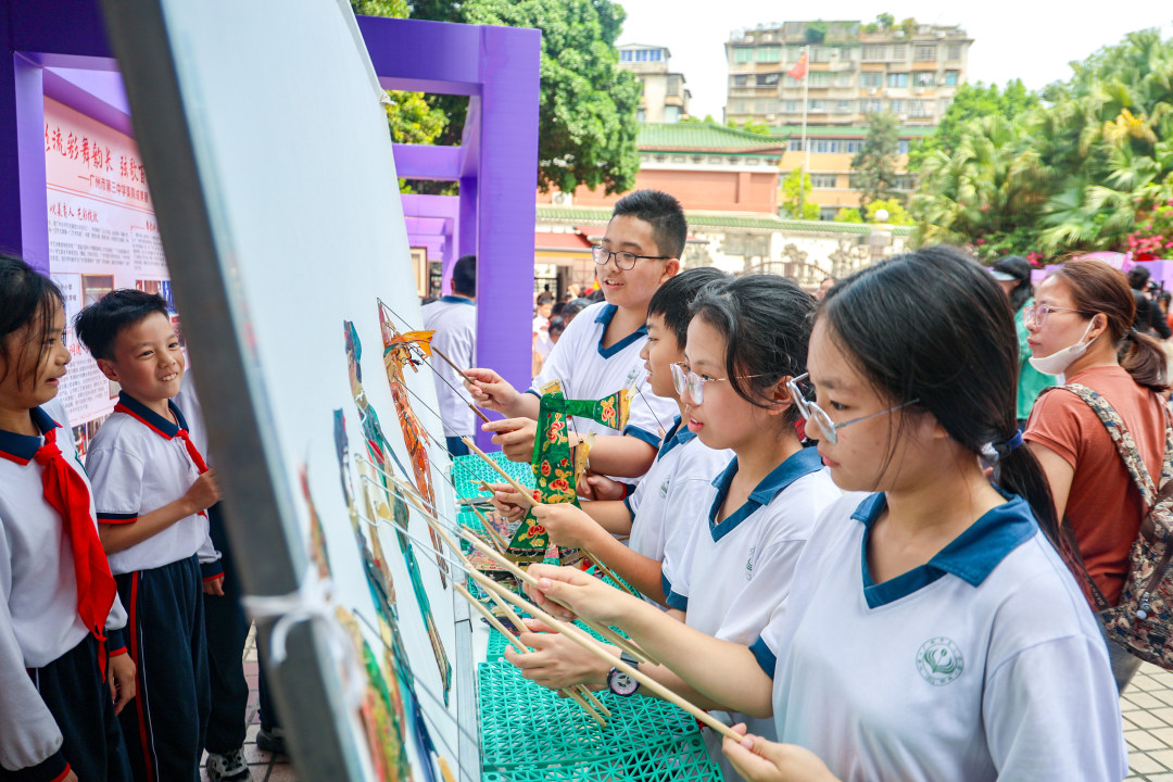 10个摊位前热闹非凡,人潮涌动。非遗技艺、戏曲唱腔、典雅艺术在这里交相辉映:从精美云肩与通草画到威武灵动的龙狮,从声情并茂的粤剧到丰富多彩的非遗作品……各校亮出“看家本领”,共同构成了“一校一品、各美其美”的生动图景。