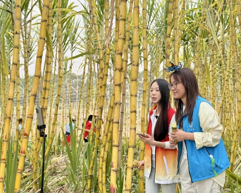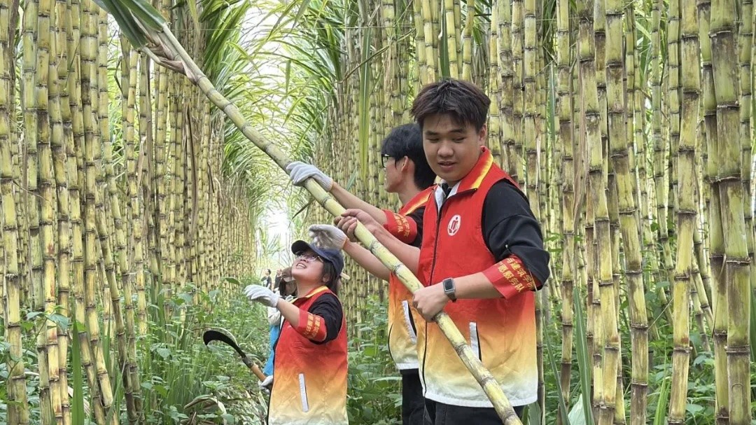 为进一步拓宽助农销路,广松职艺术与建筑学院直播团队把直播间搬进田间地头。主播走进蔗田深处,实时展示志愿者砍蔗、捆蔗的热闹场景,近距离展示地里粗壮饱满的新鲜甘蔗,讲解本地甘蔗清甜多汁的优质特点。
