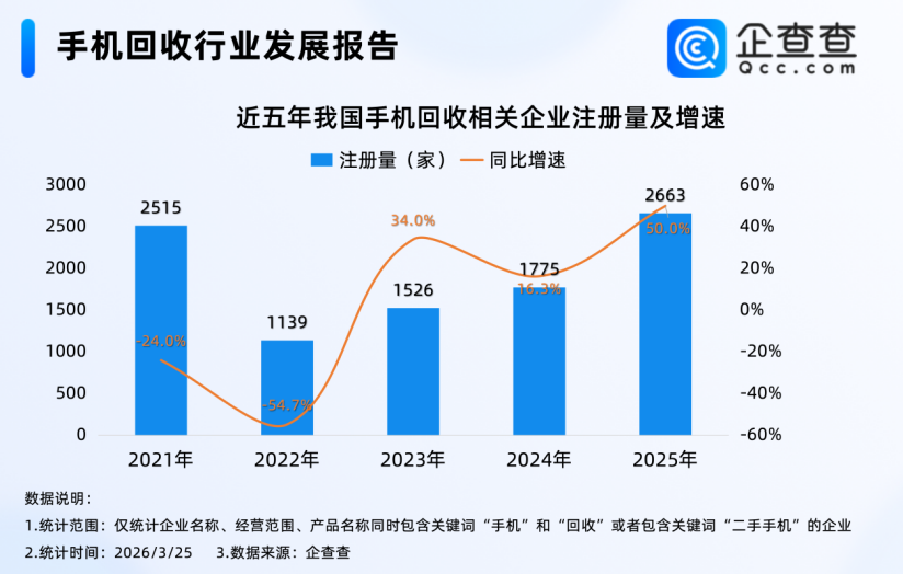 二手回收市场涨价,也带动了全民“淘旧”变现兴起。企查查数据显示,2025年手机回收企业注册量同比大幅增加50.0%至2663家,创近五年注册量及其增速双高峰;其中,华东地区2025年相关企业注册量最多,占比32.0%。企业存量方面,2021年以来,我国手机回收相关企业每年存量保持在2万家左右。截至2026年3月25日,我国现存2.2万家手机回收相关企业。