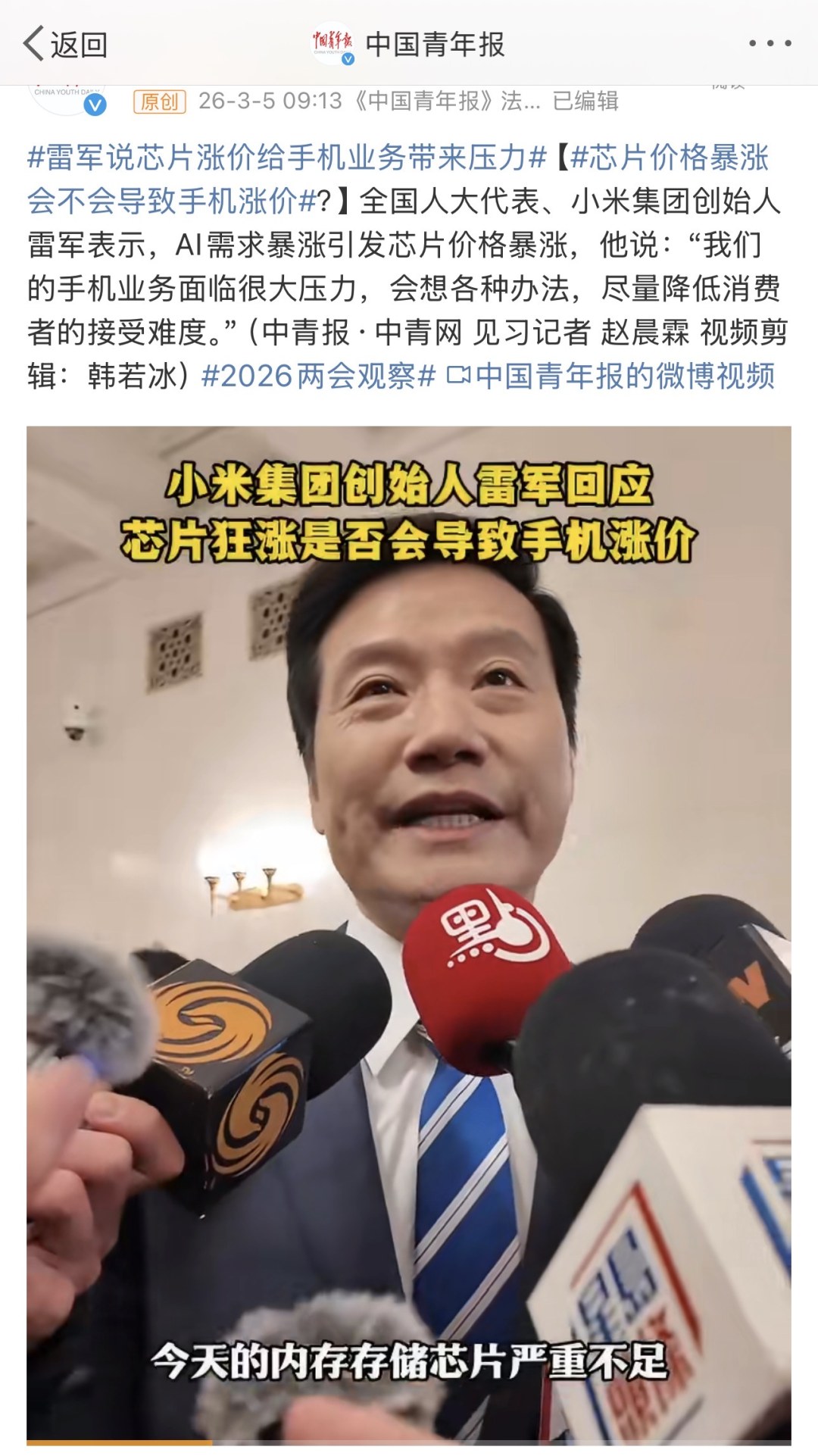 小米集团创始人雷军也在近日接受媒体公开采访时表示,“由于整个AI需求暴涨,今天的存储芯片严重不足,内存芯片确实在狂涨”。