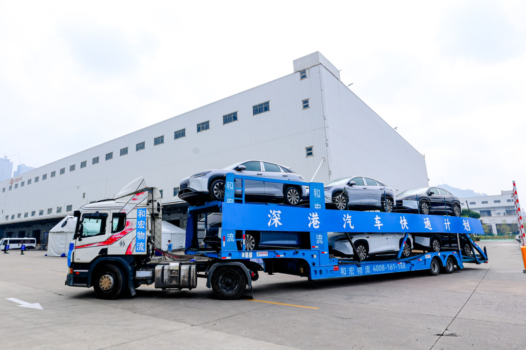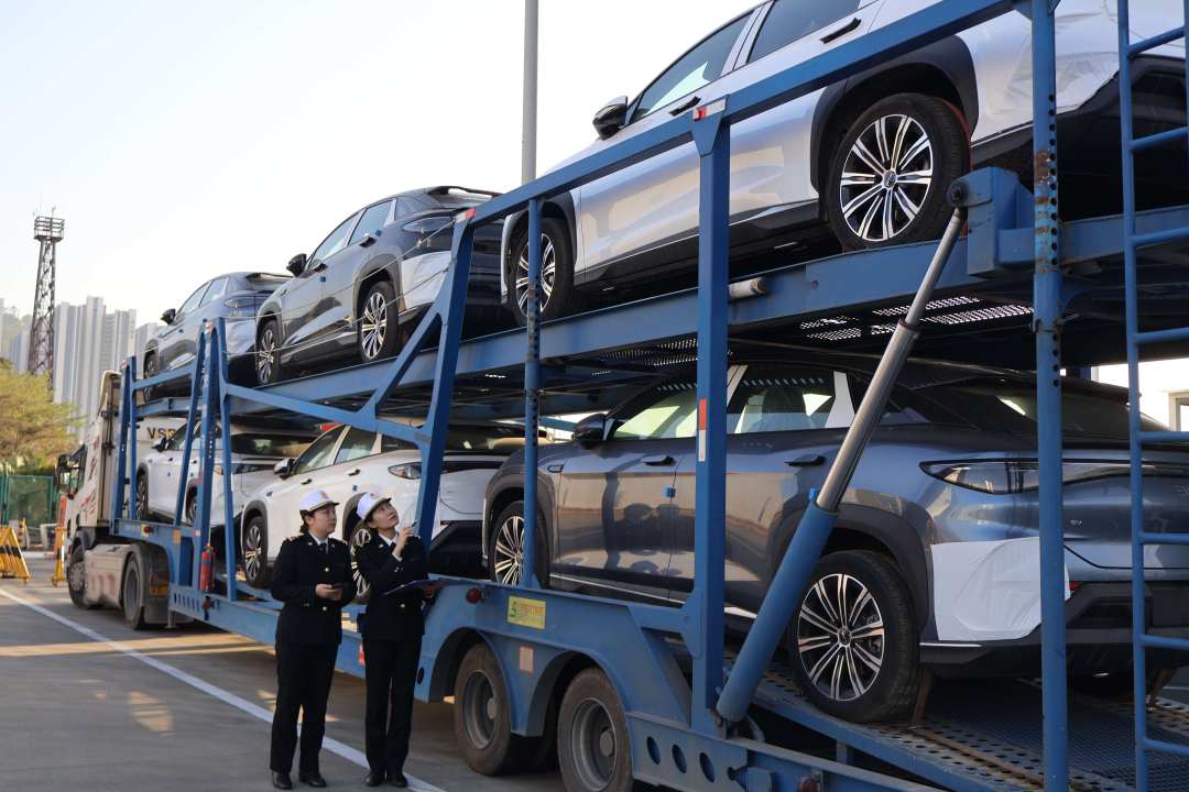 深圳海关所属蛇口海关关员对一批新能源汽车进行入区前监管。