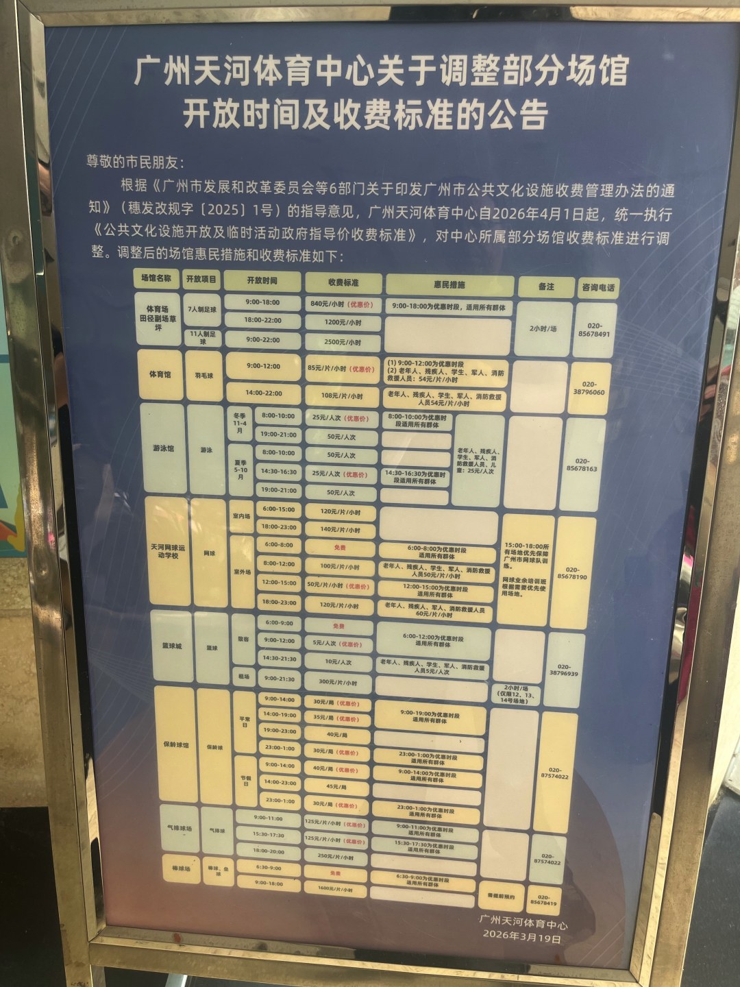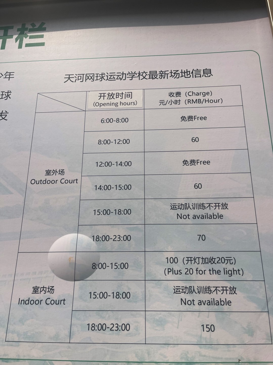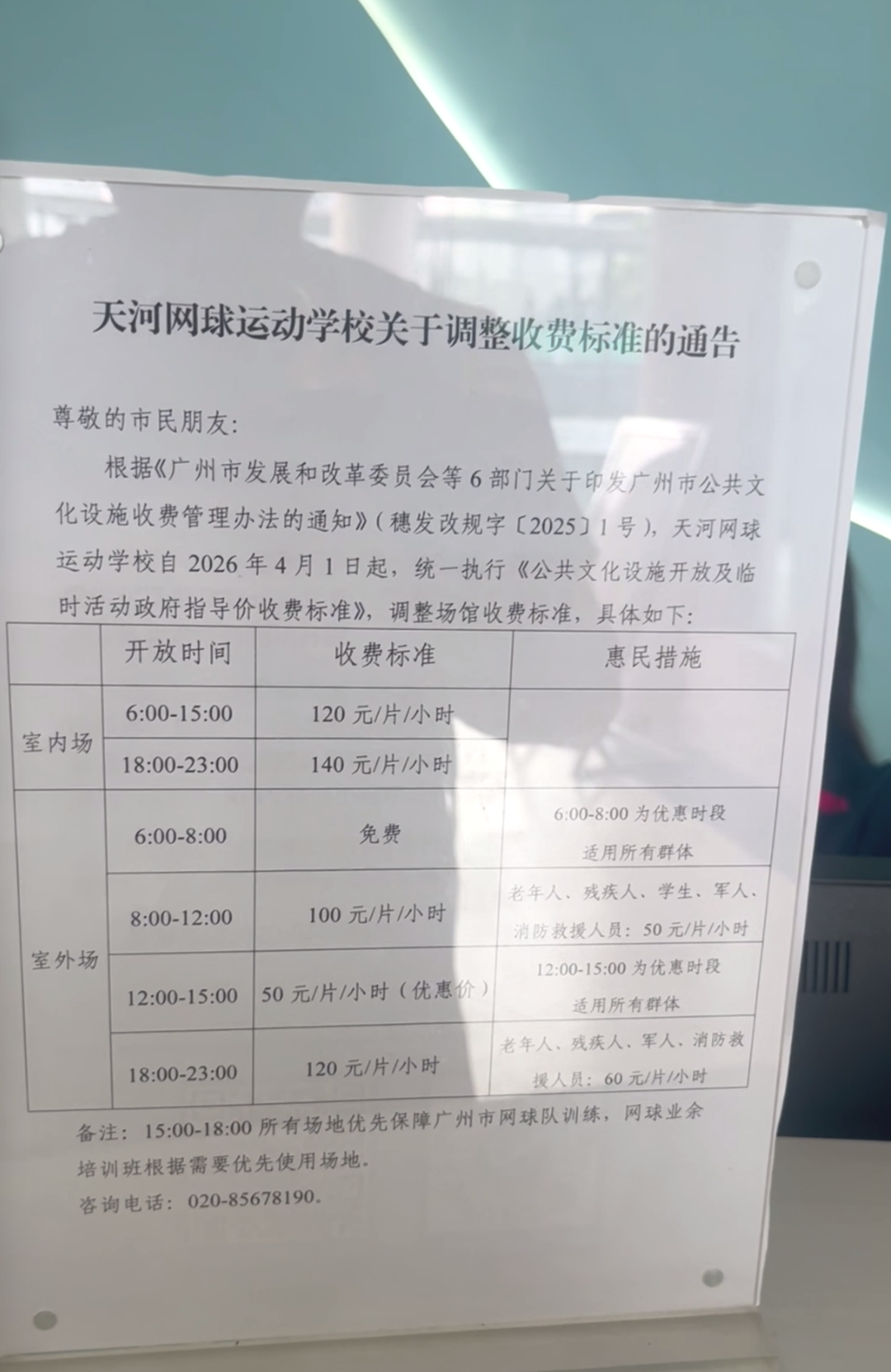 记者昨日来到天河体育中心网球场(天河网球运动学校网球场)看到,球场外面多个地方都张贴了球场即将进行价格调整的通知。调整场馆收费标准,具体如下: