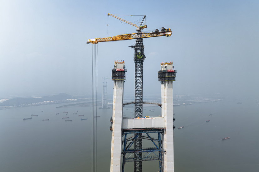 塔柱和横梁钢壳节段完成制造后,将整体运输至桥址,再利用全球最大移动平衡重塔式起重机,吊装至高空进行毫米级精准对接。