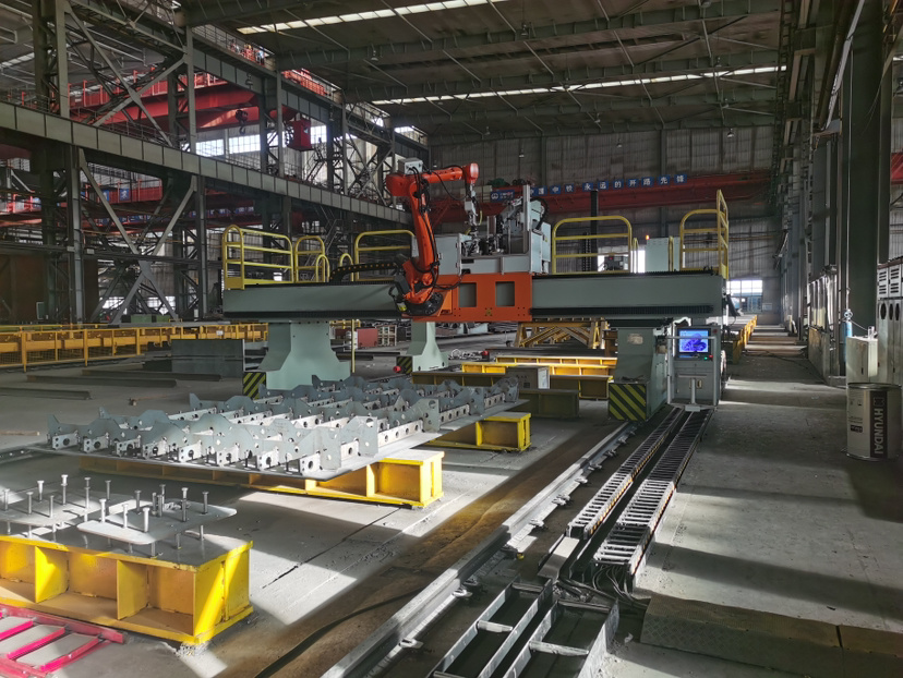 依托狮子洋通道的大体量、高精度钢壳制造,负责制造的中铁山桥和中铁宝桥集团,正推动从单个设备智能化,转向融合BIM模型及AI技术的整体智能化产线布局。智能管控系统如同“大脑”,贯穿研发设计、制造作业、运营管理等全流程,操作员输入口令,后台即可自动调度资源、调整参数,指挥五条生产线协同作业,超10万条焊接数据也被同步录入。此外,项目搭建了国内首套剪力钉自动焊接生产线,并研发专用焊接机器人,板单元焊接自动化率达到100%。
