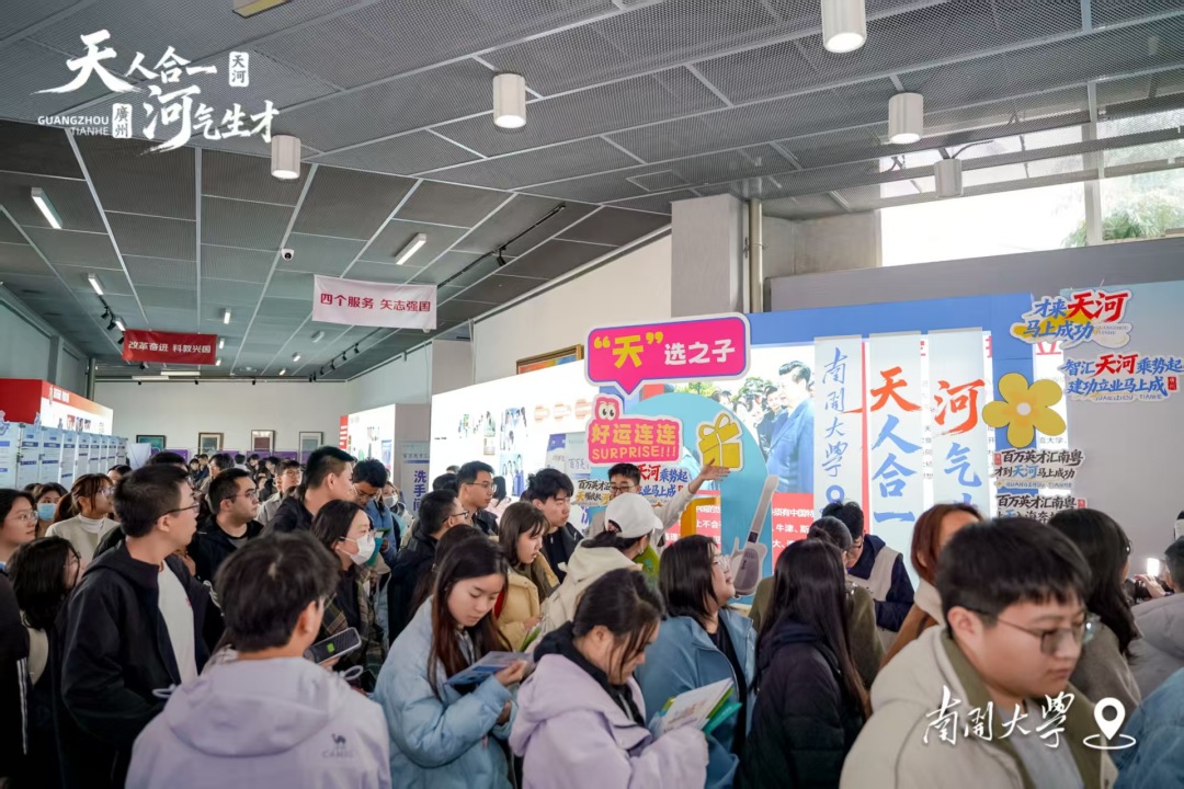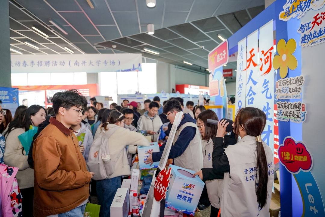为使学子更直观地感受湾区魅力,沉浸式城市体验元素贯穿双校专场。在南开大学,现场被布置为“津天遇见天河”主题漫展,通过创意打卡、引才官互动传递城市潮流感。在天津大学,举办的“粤年轻·粤精彩”人才嘉年华现场不仅设置互动游戏与乐队表演,更特意准备了寓意“掂过碌蔗”(粤语,意喻事情顺利)的广东甘蔗赠予学子,祝愿同学们求职之路“节节高升、甜上加甜”。