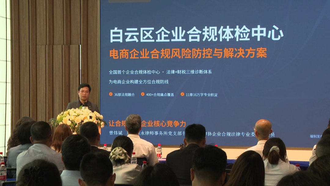 在当天的仪式现场,“百名律师进千企惠万家”巡回宣讲活动启动,2024—2025年度白云区优秀公益法律服务律师事务所、律师代表获颁荣誉证书。广东谨然律师事务所、华商林李黎(前海·广州)联营律师事务所等12家律所,李伟军等30名律师获通报表扬。广州市调解协会专家曾颖祺围绕《直播电商监督管理办法》的实施影响及典型案例进行了深度解析,白云区企业合规体检中心负责人、律师曾炜斌向参会企业详细推介了“白云合规治理服务包”。