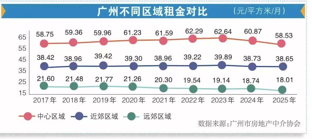 其次,从区域结构来看,资产价格的保值性与租金稳定存在一定错位。对于持有低总价单位收租的置业者而言,“保值”十分重要,因此大多选择核心区,但租房市场的逻辑却有所不同。根据广州市房地产中介协会的数据,2025年,广州近郊区域近年来表现更为平稳,基本在每平方米38~39元之间。该协会分析指出,这主要是由于随着各项市政配套持续完善,近郊区域有效承接部分市中心外溢的租赁需求,同时再加上自身逐步成熟的产业发展,因此租金较为稳定。