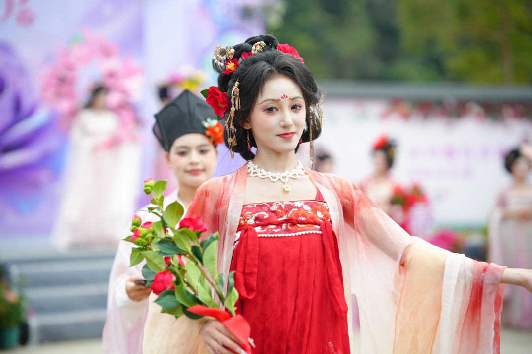 春日正值花期,景区内绣球花、三角梅等竞相绽放,大花篮、巨型花束、许愿池等景点也成为游客拍照打卡的热门地点。主办方表示,本届花朝节旨在以花为媒、以山为景,为市民游客呈现一场沉浸式国风体验。