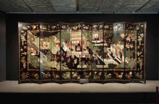 另一件清康熙黑漆的款彩《郭子仪贺寿图》屏风,更引得现场观众纷纷拍照打卡。屏风共十二扇,长达6.25米,描绘的是民间广为流传的“郭子仪贺寿”吉祥题材,众多人物栩栩如生,尽显清代工艺的精湛与民俗文化的底蕴。这件庞大而精美的屏风,如当年众多从广州流传至欧洲的艺术品一样,深受西方社会的追捧。香奈儿品牌创始人嘉柏丽尔·香奈儿就尤为钟情于来自中国的乌木漆面屏风,一生收藏多达32面。这些艺术品成为西方想象“东方世界”的范本,构成了中西贸易史背景下文化交流的有力见证。