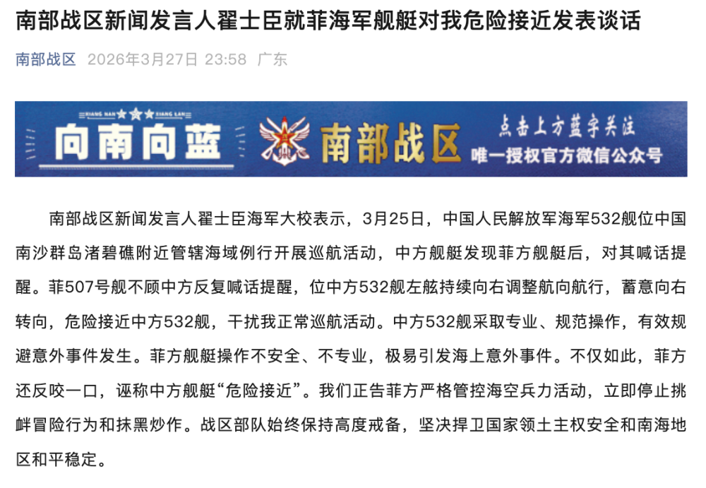 南部战区新闻发言人翟士臣海军大校表示,3月25日,中国人民解放军海军532舰位中国南沙群岛渚碧礁附近管辖海域例行开展巡航活动,中方舰艇发现菲方舰艇后,对其喊话提醒。菲507号舰不顾中方反复喊话提醒,位中方532舰左舷持续向右调整航向航行,蓄意向右转向,危险接近中方532舰,干扰我正常巡航活动。中方532舰采取专业、规范操作,有效规避意外事件发生。菲方舰艇操作不安全、不专业,极易引发海上意外事件。不仅如此,菲方还反咬一口,诬称中方舰艇“危险接近”。我们正告菲方严格管控海空兵力活动,立即停止挑衅冒险行为和抹黑炒作。战区部队始终保持高度戒备,坚决捍卫国家领土主权安全和南海地区和平稳定。