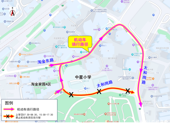近日,广州市公安局交通管理支队发布公告称,为进一步优化越秀区中星小学(东校区)周边道路交通组织,提升区域通行效率、缓解道路高峰期交通拥堵,广州交警将于近期在越秀区太和岗路中星小学(东校区)对出路段实施“上学日时段单向通行”的优化措施。