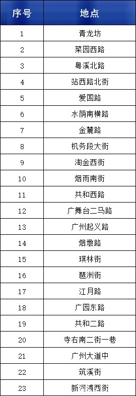 取证违法行为的重点路段共23条,涉及青龙坊、淘金西街、共和西路、广州大道中、新河浦西街等。