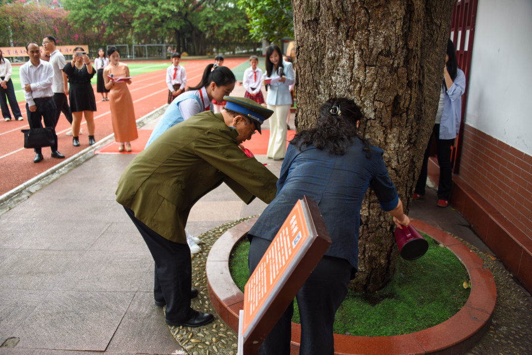 舞台表演结束后,学生讲解员为来宾介绍了伟人视察棠下的历史。随后,参加活动人员代表一起来到芒果树下,共同参与“浇灌未来·薪火相传”仪式。众人为芒果树浇灌清水,象征着社会各界对少年儿童成长的关怀与期许,希望孩子们在红色文化滋养下,向下扎根,向上生长。最后,嘉宾们参观了学校长征主题展览,重温那段波澜壮阔的红色岁月。
