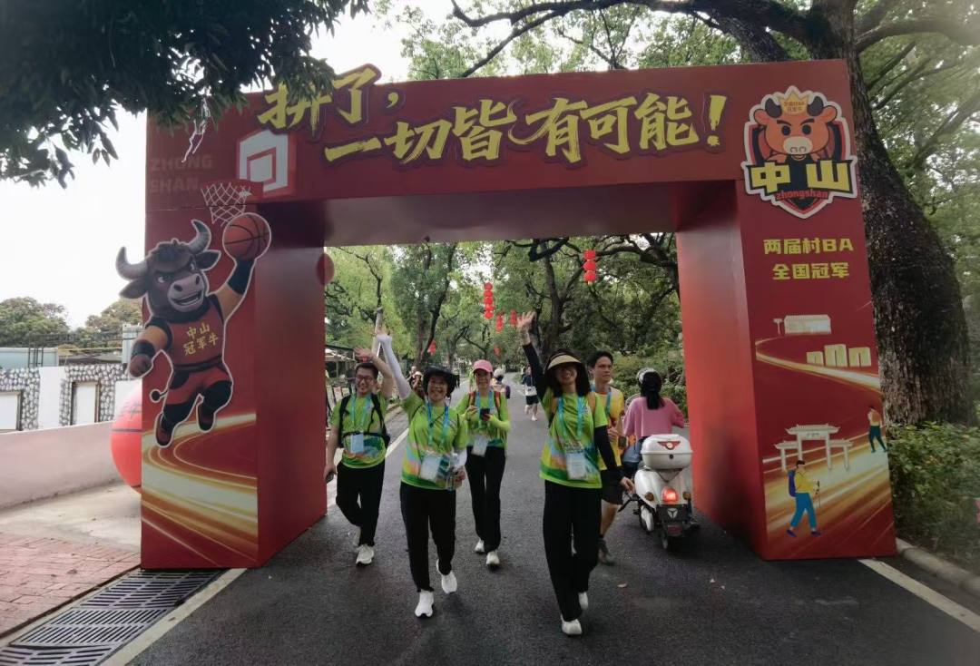 徒步当天,恰逢粤BA中山主场对阵茂名。沿途粤BA主题横幅随处可见。走进旗溪村,“向中山篮球队和拉拉队战士学习”“爱拼才会赢”“拼了一切皆有可能”等标语格外醒目。粤BA中山队首战精彩图展吸引众多徒步者围拢观看。在“冠军牛”主题打卡点,“冠军牛”一家惊艳亮相,成为徒步路上的惊喜。大家纷纷与“冠军牛”家族合影拍照,体验投篮互动,为接下来的赛事加油助威。现场,拉拉队也热情起舞、高喊口号,将赛场上的热血与激情带到乡村山野。