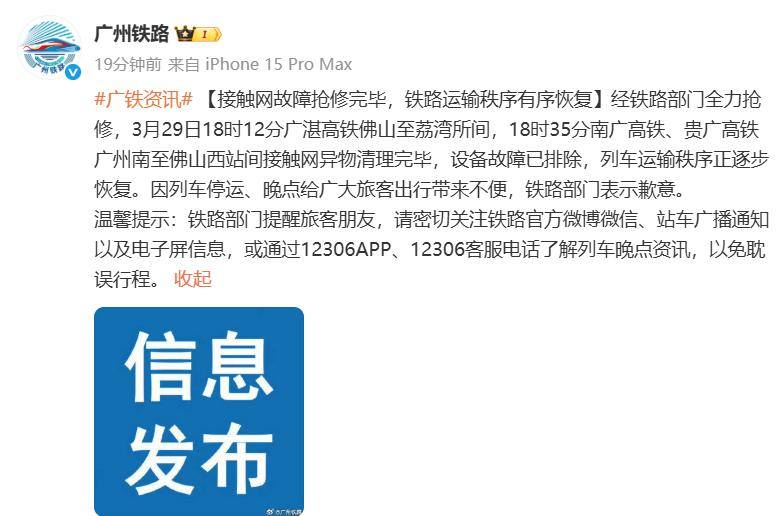 经铁路部门全力抢修,3月29日18时12分广湛高铁佛山至荔湾所间,18时35分南广高铁、贵广高铁广州南至佛山西站间接触网异物清理完毕,设备故障已排除,列车运输秩序正逐步恢复。