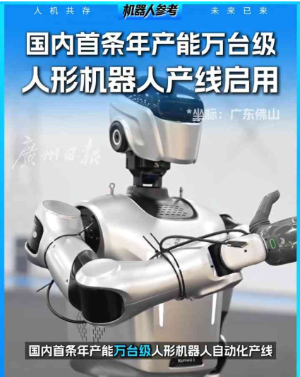 【佛山建成国内首条年产能万台级人形机器人产线】国内首条年产能万台级的人形机器人自动化产线在佛山正式投入使用,人形机器人规模化量产能力取得重大突破。该产线年产能突破一万台,可实现每30分钟下线一台人形机器人,高效满足市场规模化交付需求。详情>>