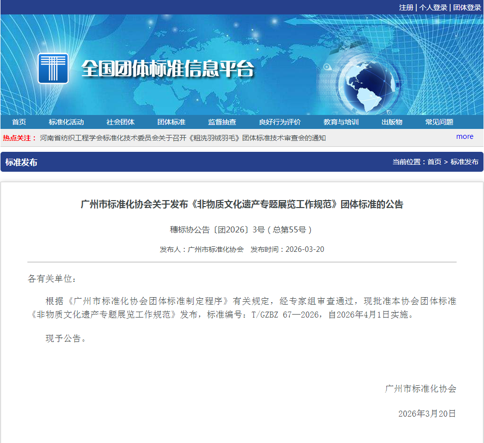 3月20日,由广州市文化馆(广州市非物质文化遗产保护中心)提出并牵头编制的团体标准《非物质文化遗产专题展览工作规范》正式发布,将于2026年4月1日起实施。