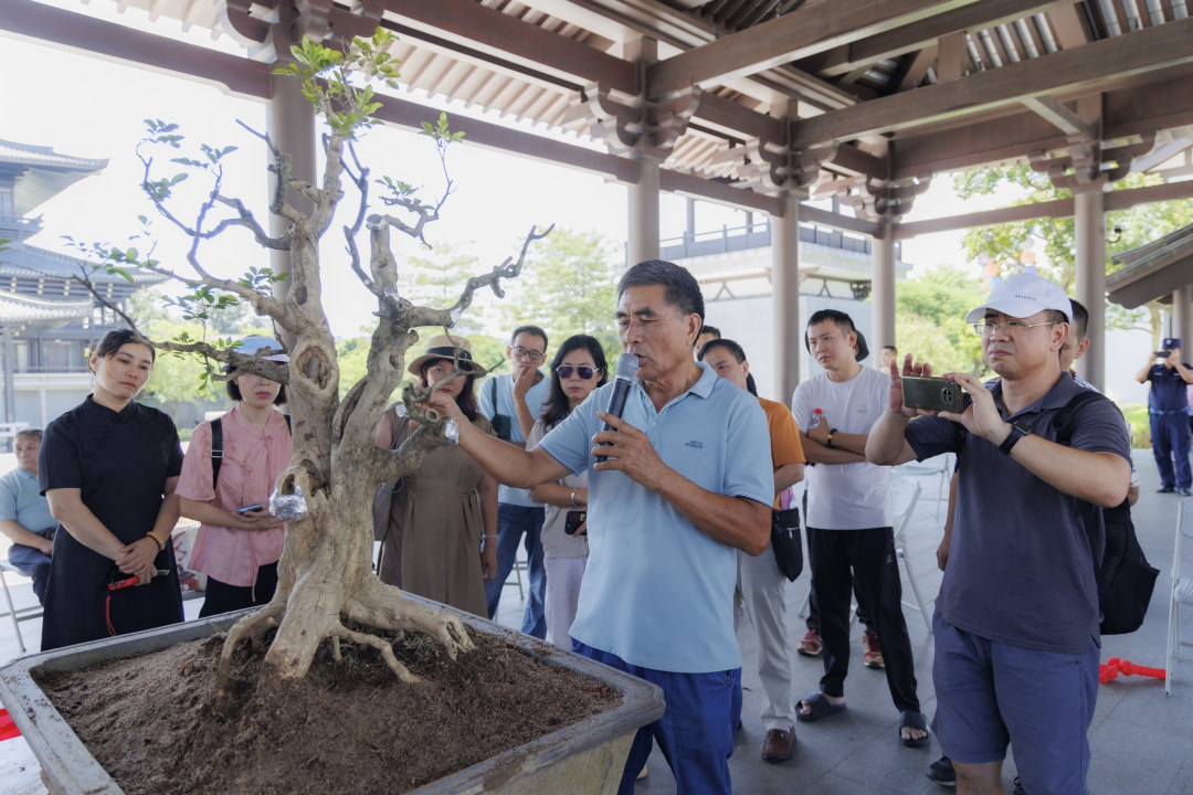 2024年9月15日,“翠脉常青——岭南盆景艺术推广季”开幕式后,岭南中国盆景艺术大师陆志伟向市民游客讲解岭南盆景