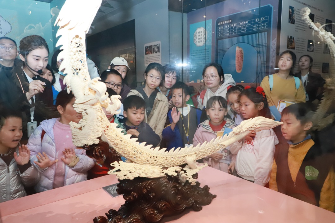 2025年1月18日,广州市文化馆中心阁“仙工神品——广州象牙雕刻展”展厅,讲解员在向小观众介绍牙雕作品