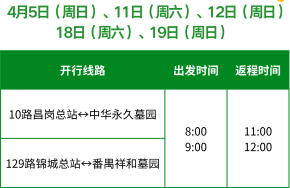 为进一步便利市民祭祖出行,解决前往墓园的交通不便问题,一汽巴士三分公司开行2条清明便民线,往返中华永久墓园、番禺祥和墓园,为市民提供更便捷、更舒适的直达出行服务。其中,前往中华永久墓园的市民,可在10路昌岗总站乘车;前往番禺祥和墓园的市民,可在129路锦诚总站乘车。市民可通过微信搜索“广州市一汽巴士有限公司”小程序,查询两条便民专线的具体开行日期、班次时刻等详细信息,提前规划出行行程。