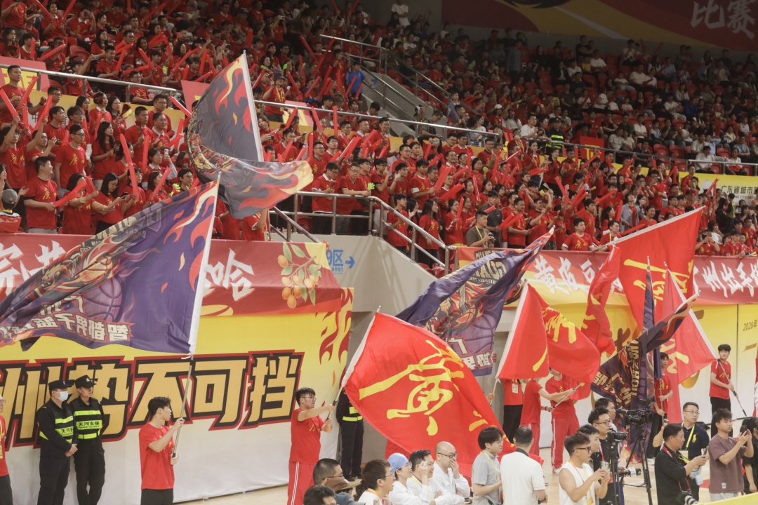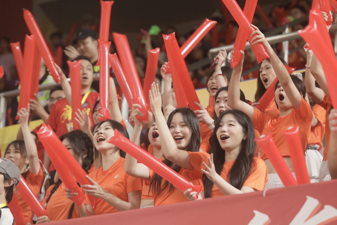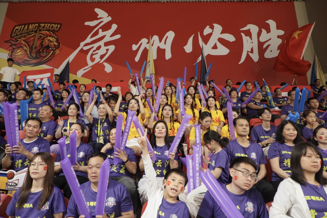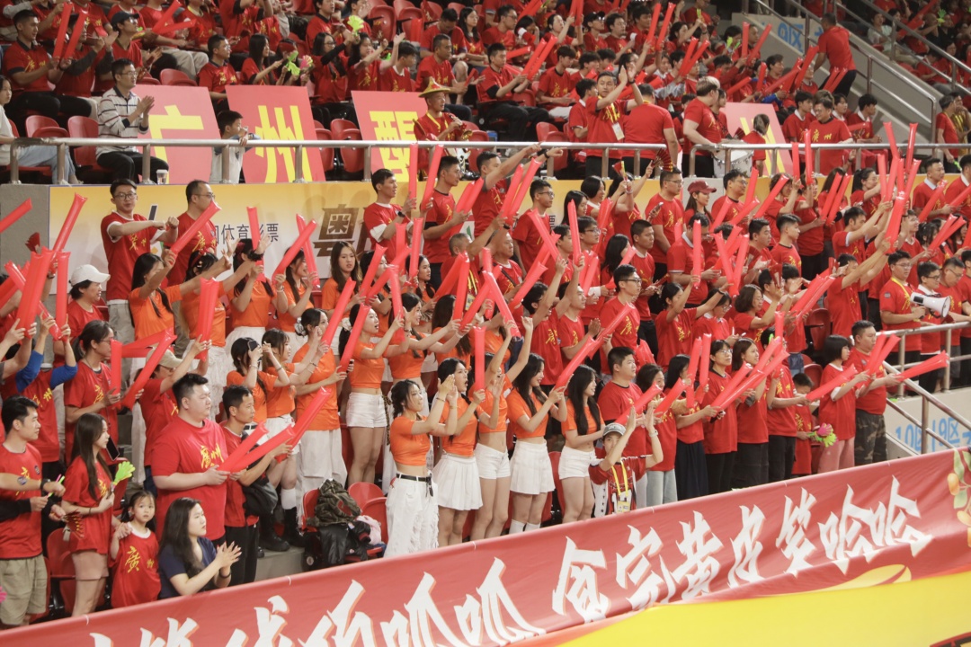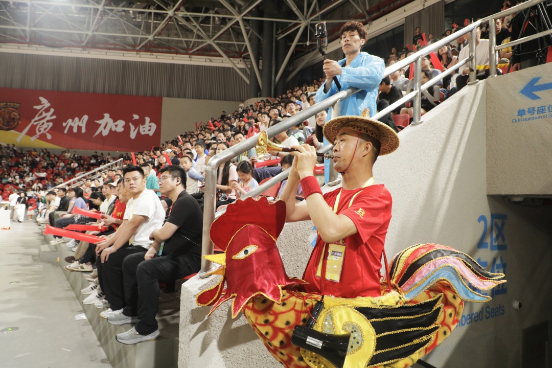 广州球迷创意十足,手持不锈钢盆、南沙甘蔗助威,尽显岭南特色。 赛事现场互动丰富,气氛热烈。梁山山等艺人登台献艺,《外来媳妇本地郎》演员亮相,合唱《红日》《海阔天空》点燃全场。