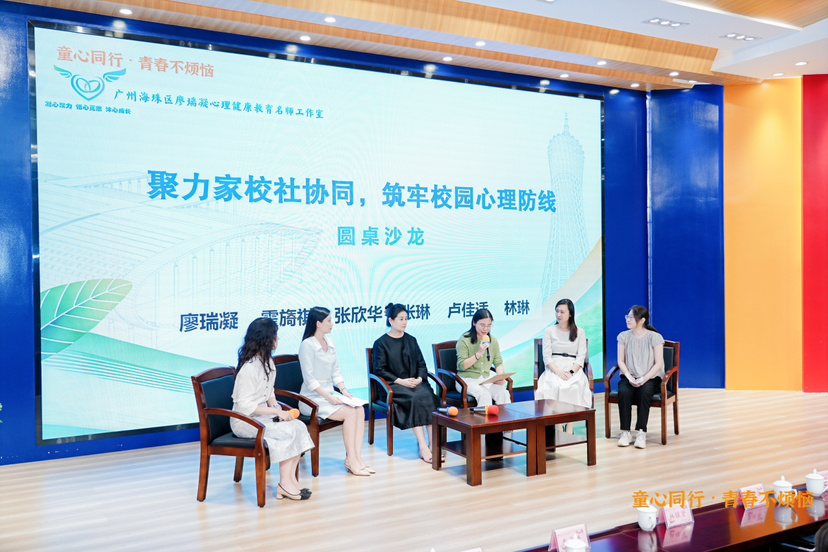 在备受关注的圆桌沙龙环节,一场聚焦心理健康教育实践的高质量对话精彩展开。海珠区童心青少年社会心理服务中心张欣华博士、海珠区心理健康教育名师工作室主持人卢佳适与廖瑞凝、海珠区第四实验小学校长张琳,宝玉直实验小学专职心理教师、副班主任、海珠区心理健康教育名师工作室主持人霍旖祺,一线资深社工代表林琳与参与培训的老师们面对面交流,围绕校园心理建设、家校协同沟通、学生情绪疏导等热点议题,展开了多维度、深层次的交流探讨。对话紧扣青少年心理健康教育一线真实案例,直面校园与家庭在心理健康工作中的难点、痛点问题,现场答疑解惑,从专业视角提出针对性解决方案与实践建议,为家校社协同开展心理关爱工作提供明晰方向与务实路径。