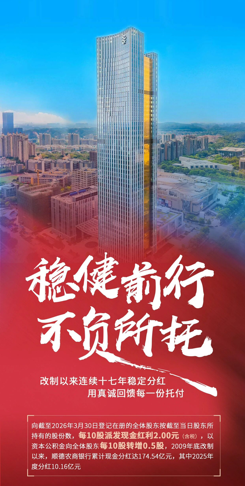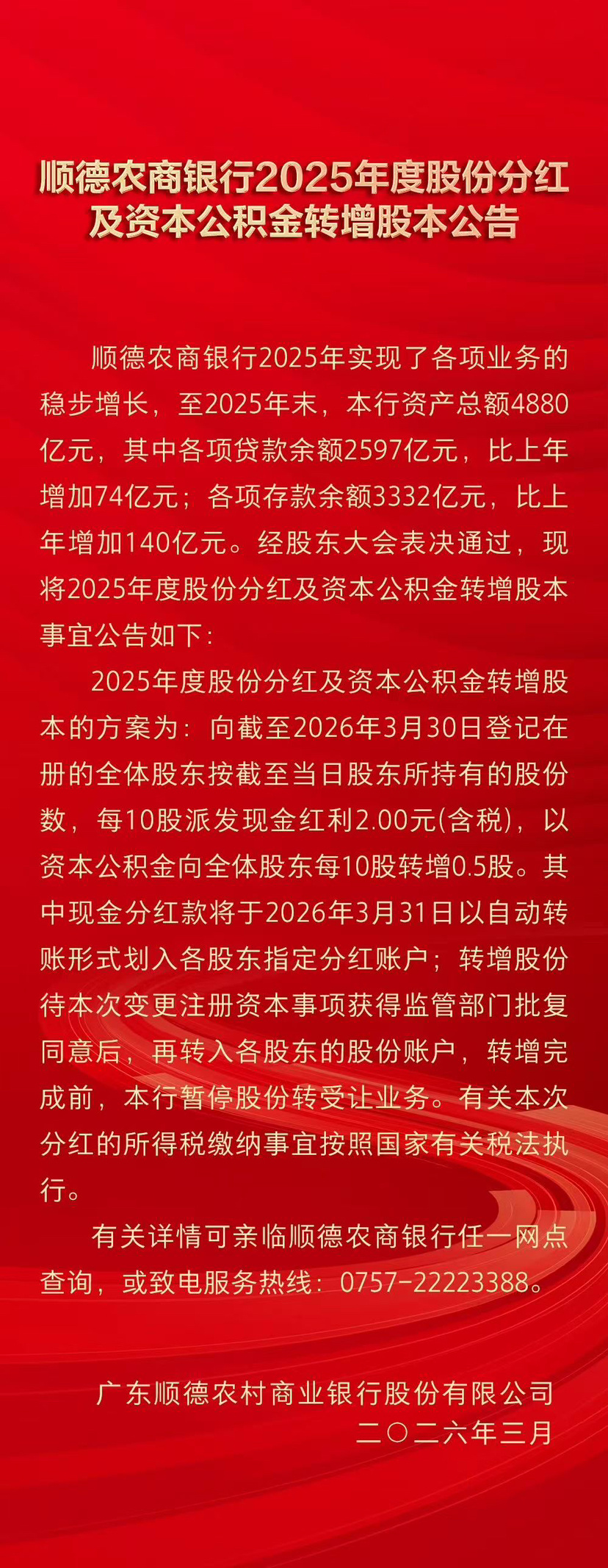 广东顺德农村商业银行股份有限公司(以下简称“顺德农商银行”)今日正式发布了《2025年度股份分红及资本公积金转增股本公告》。根据公告,该行将向全体股东实施每10股派发现金红利2.00元(含税)、每10股转增0.5股的分红方案。在资产规模稳步扩大的同时,该行通过“现金分红+资本公积金转增”的组合方案,兼顾股东回报与自身资本实力的增强。