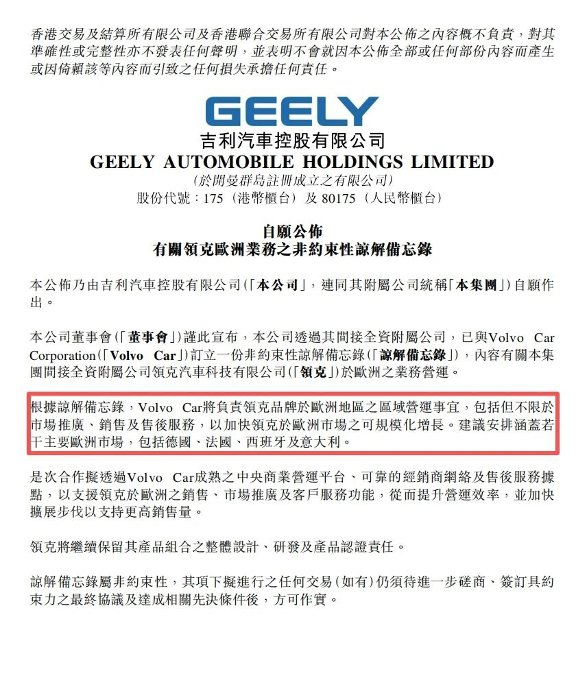 3月30日,吉利汽车(0175.HK)发布公告,沃尔沃汽车与吉利汽车签署了一份非约束性谅解备忘录(MoU),拟就领克在欧洲建立新的商业合作伙伴关系。