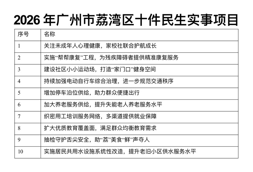 3月31日下午,广州市荔湾区第十七届人民代表大会第六次会议圆满完成各项议程,胜利闭幕。大会票决产生了2026年荔湾区政府十件民生实事项目。