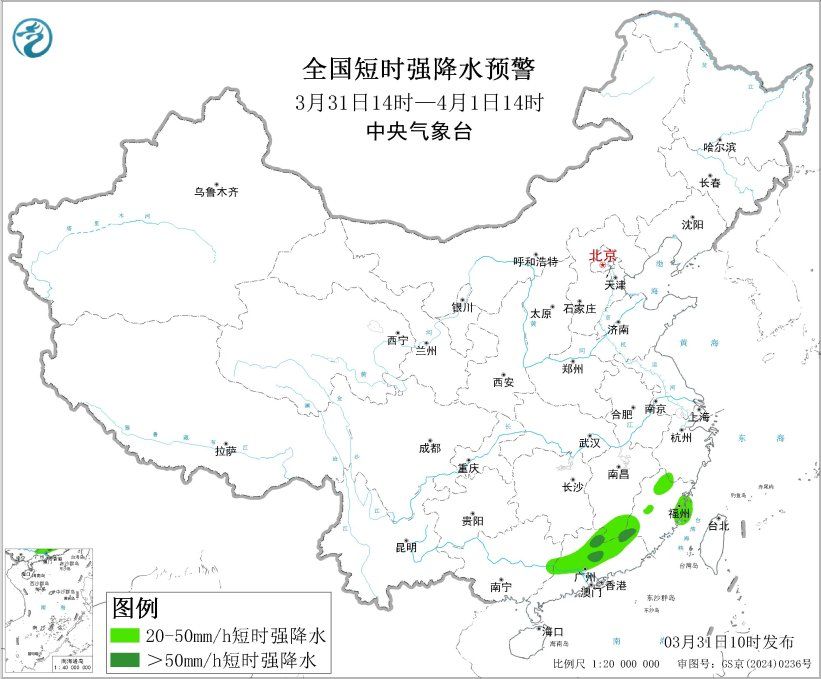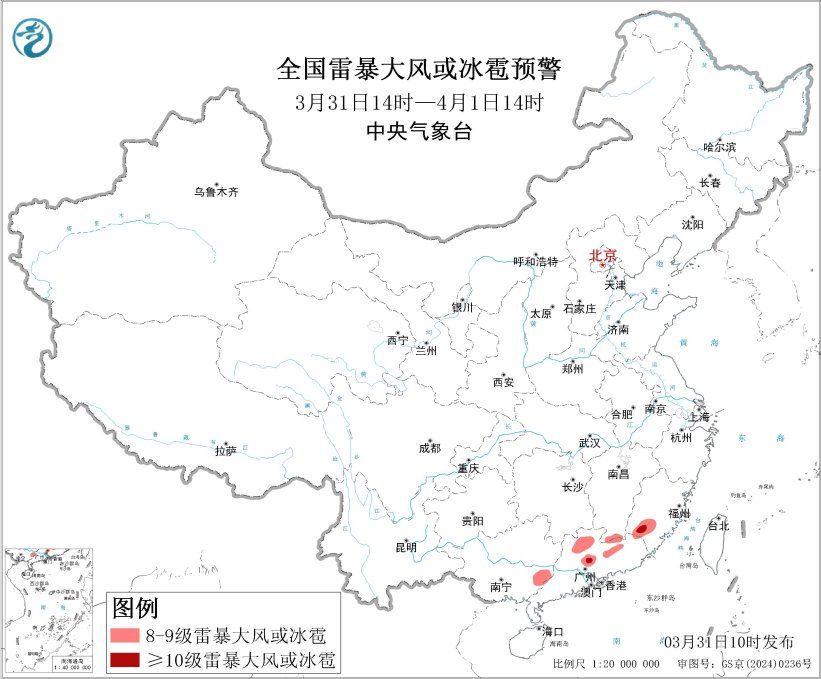 据中央气象台,预计3月31日14时至4月1日14时,广东中部等地的部分地区将有10级以上雷暴大风,最大风力可达11级以上;广东中北部等地的部分地区小时雨量大于50毫米,最大可达60毫米以上。