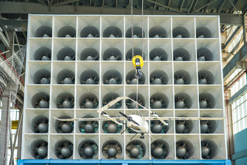 在传统闭口试验段基础上,该风洞还兼有国内领先的大尺度风墙试验系统,该系统能够模拟持续风、阵风及风切变等典型低空环境风型,并支持不同空间分布与时间变化特性的风场重构,可真实复现城市环境、海上环境及复杂地形条件下的气流特征。在此基础上,可开展无人机及低空飞行器的抗风性测试、飞行稳定性评估及控制策略验证。通过风洞与风墙协同,可实现从标准气动验证到复杂环境适应性验证的完整技术闭环,为飞行器安全边界确定、适航评定及应用场景落地提供关键支撑。