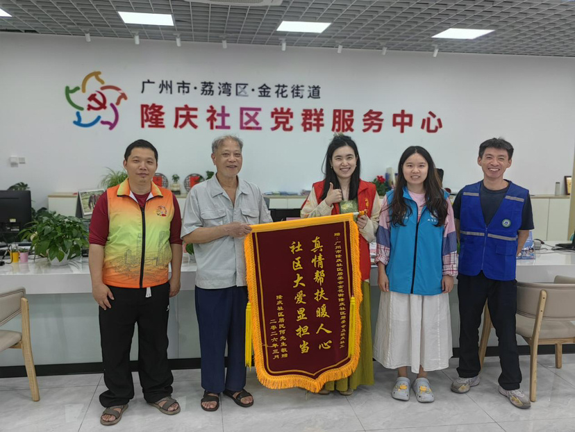 4月1日下午,广州荔湾区金花街道隆庆社区内暖意融融,辖区孤寡老人何姨的亲属专程来到社区,将一面印有“真情帮扶暖人心 社区大爱显担当”字样的锦旗送到社区工作人员手中,以最质朴的方式,向始终牵挂老人安危、倾力帮扶解难的社区党委,表达最诚挚的感激之情。