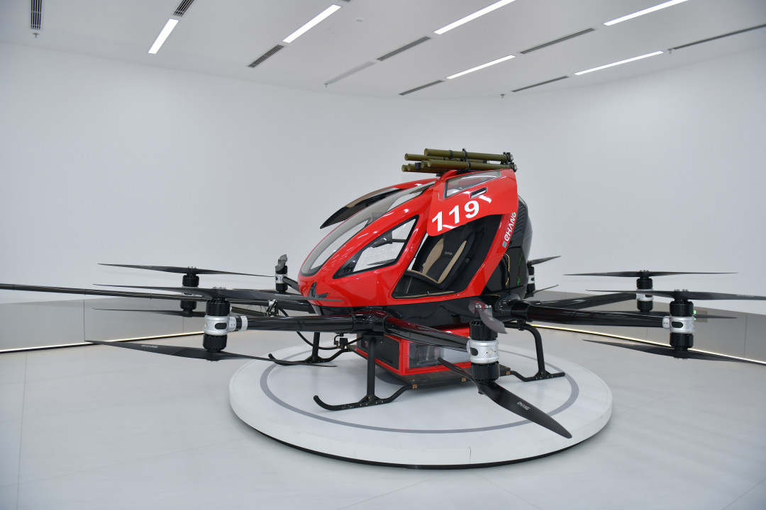 3月30日,在“科技广州新观察”系列采访活动中,记者走进亿航智能。图为亿航智能展厅里展示的消防无人驾驶航空器。