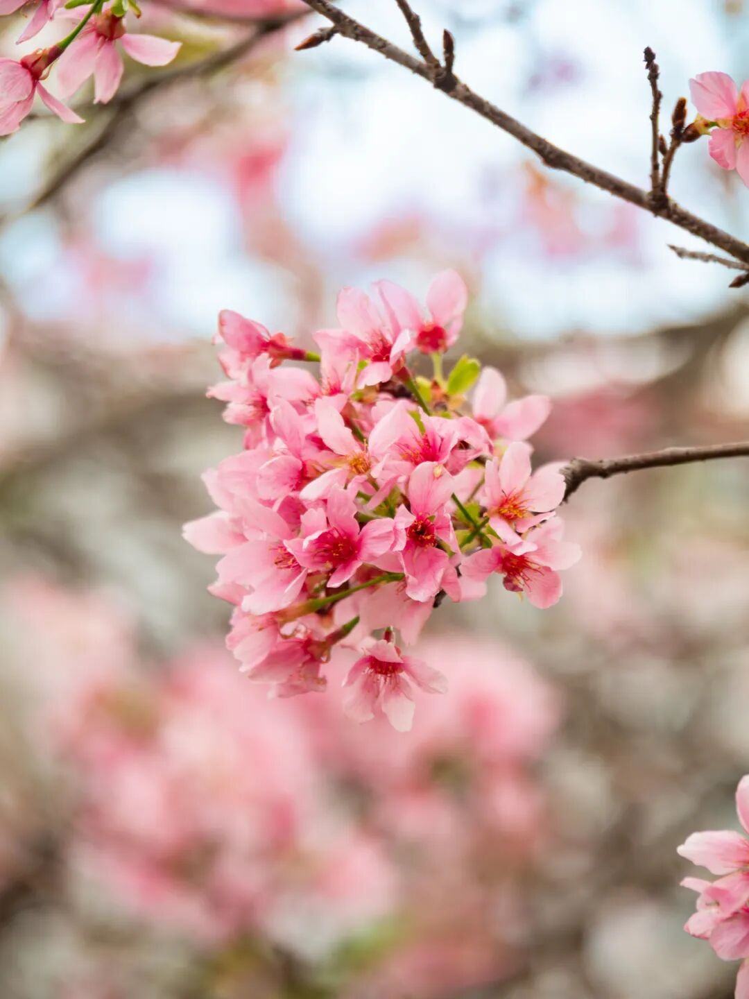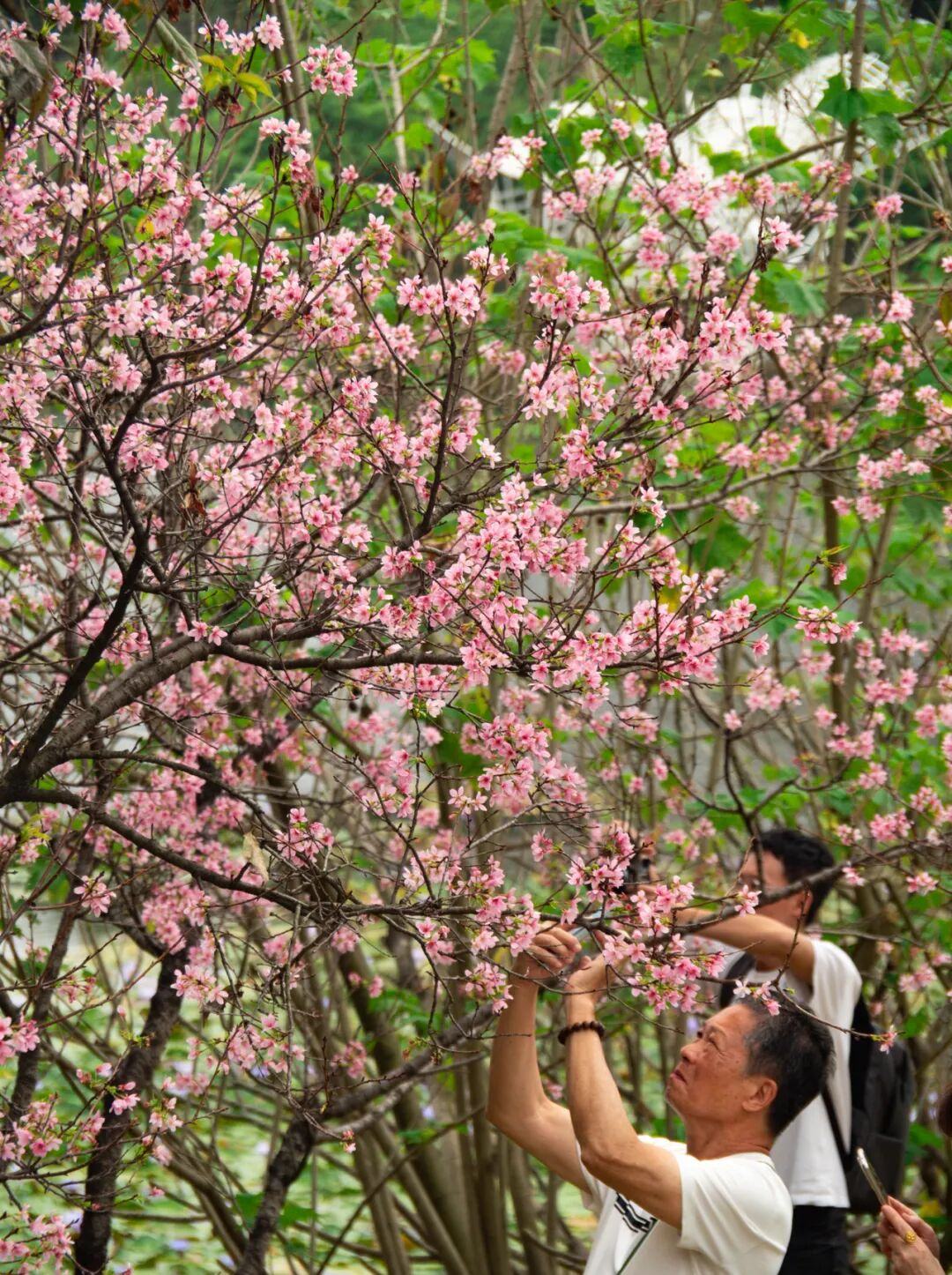 创业公园近期盛放的是专为岭南气候培育的“广州樱”,花色粉白相间,清透淡雅,繁花满枝。