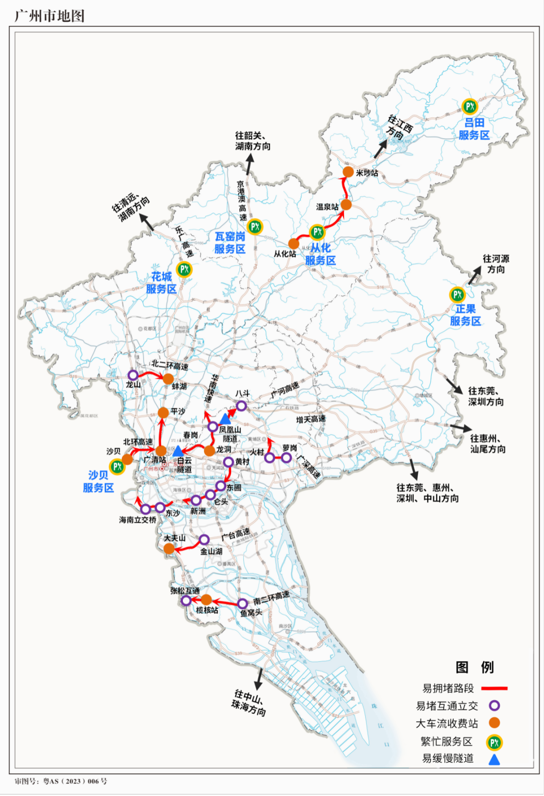 进出城高峰期间,短时车流聚集易出现局部缓行,易缓行路段主要集中在北环高速、北二环高速、广河高速、华南快速、广深高速、东南西环高速等高速的互通立交、隧道、路段合流瓶颈段,以及与市区主干道衔接处。