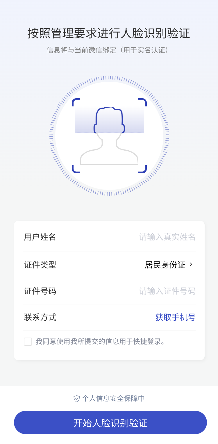 用户首次进入小程序须进行实名认证,按照屏幕提示输入姓名、证件号码、联系方式、验证手机号码,并点击“开始人脸识别验证”进行人脸核验身份。用户完成实名认证后,微信小程序账号将会与个人信息绑定。