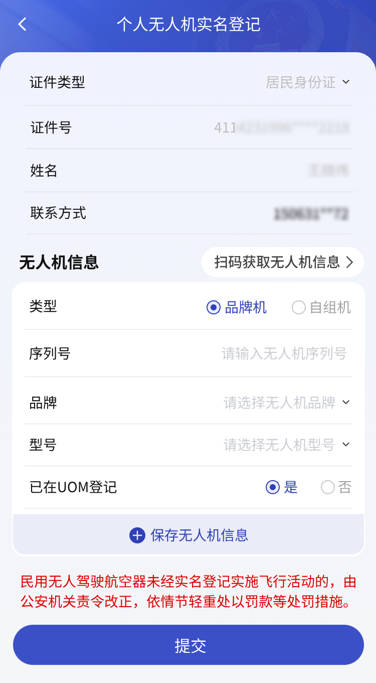 如有多架无人机则可继续按照提示填写无人机信息,每架无人机信息填写完毕后都需点击“保存无人机信息”按钮,将无人机信息保存。所有信息填写完毕后点击“提交”按钮,即可完成个人无人机信息登记。
