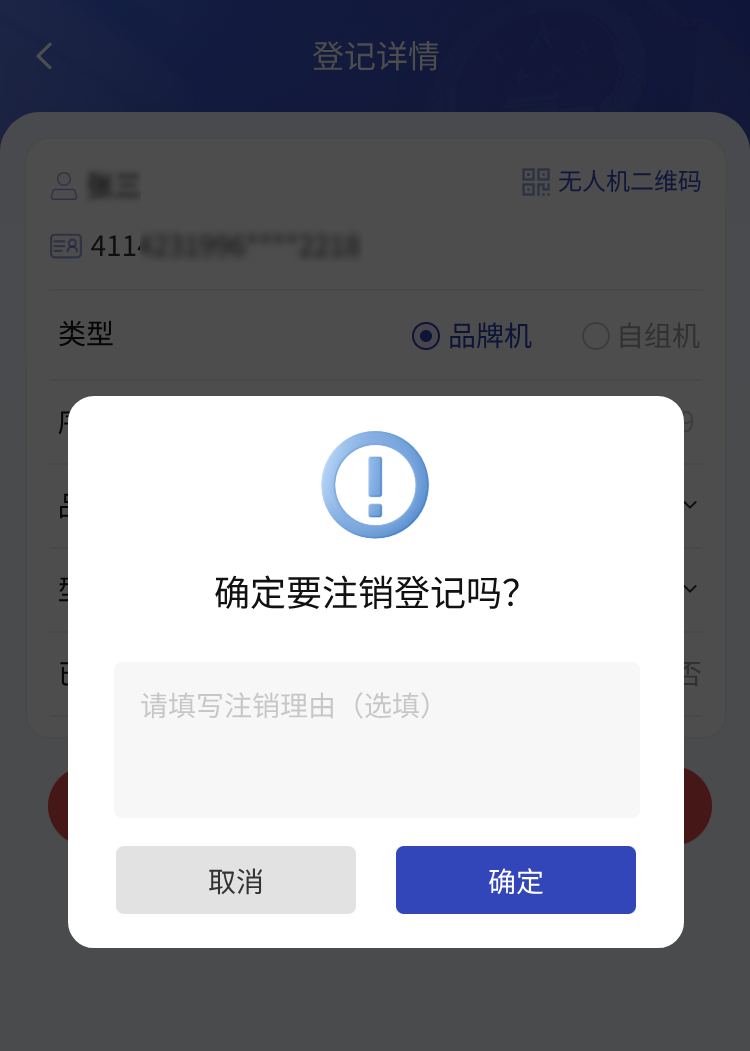 如需进行“无人机注销登记”,可在“登记详情”页面中,点击底部“注销登记”按钮,填写无人机注销登记理由,即可完成无人机注销。