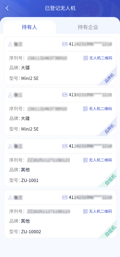 用户点击“持有人”可查看自己实名登记的无人机;用户点击“持有企业”可查看自己为企业实名登记的无人机。