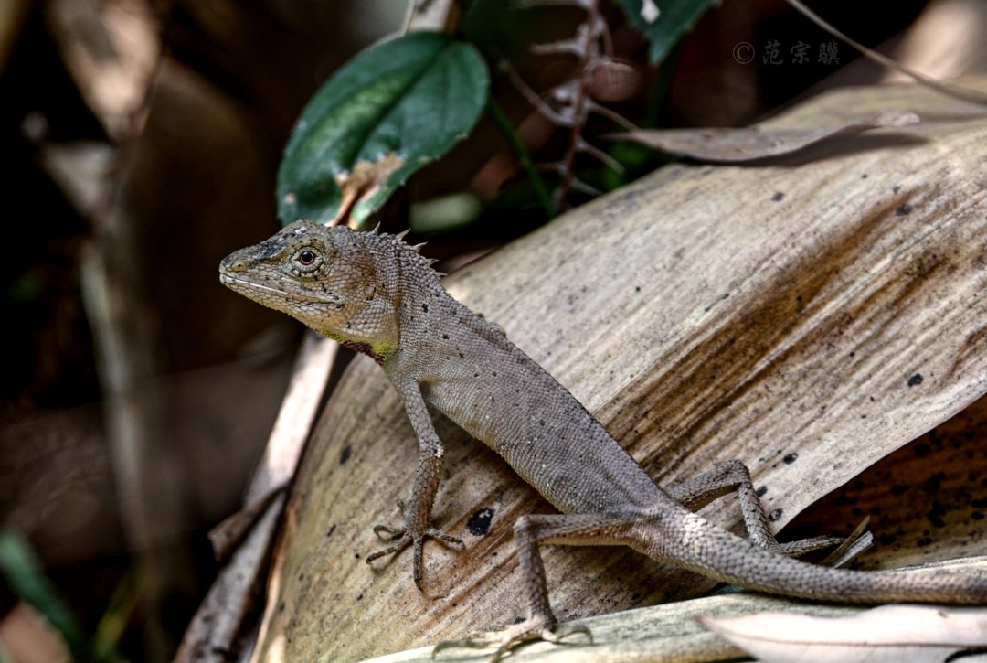 细鳞拟树蜥(曾用名:细鳞树蜥)隶属于爬行纲有鳞目鬣蜥科拟树蜥属,英文名为Burmese False Bloodsucker,是一种日行性中小型蜥蜴。该物种识别特征显著:头体长约7cm,尾长约为头体长的2倍;吻部尖长,眼周布有黑褐色辐射纹,眼下方至口角处延伸1条黑褐色细纹;喉囊形态明显,雌雄个体喉囊色彩差异突出,雄性为黄色与红褐色相间、雌性则是浅蓝色与淡藕荷色搭配;颈鬣发育较发达、背鬣相对不发达;背脊带有棱纹,背部底色多为浅褐色、灰褐色或深褐色,且散布不规则黑褐色斑点,腹部颜色较淡;其体色具有随环境影响而变化的拟态能力。