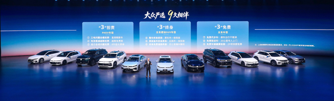 产品之外,一汽-大众同步推出“大众严选 9久相伴”专属承诺。在“三担责、三终身、三免费”九大权益中,PHEV车型专享的三电担责服务尤为醒目:因三电质量导致自燃、电池衰减超限或动力总成质量问题,厂家全权担责,极端情况免费换新车、换电池。这一承诺直接针对当前插混用户对三电可靠性的核心焦虑,试图以“大厂兜底”的方式消解购买顾虑。